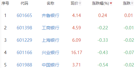 其中,齐鲁银行、工商银行、上海银行、兴业银行和中国银行位列板块涨幅前五位,涨幅分别为0.24%、-0.22%、-0.33%、-0.43%和-0.54%。