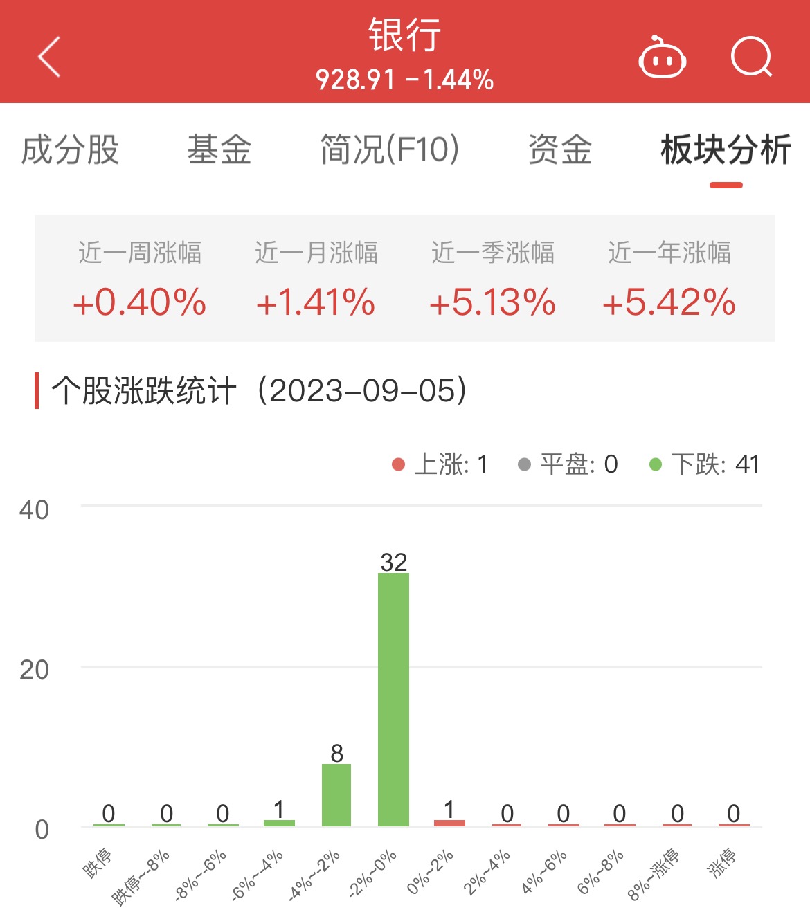 中国经济网北京9月5日讯今日,银行板块整体涨幅-1.44%,其中1只股票上涨,0只股票平盘,41只股票下跌。