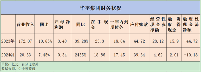 只不过从华宇集团的财务数据来看,并不乐观。据企业预警通数据披露的华宇集团2023年年报和2024年一季报显示,2023年度,华宇集团营业收入172.07亿元,同比下滑10.85%,归母净利润3.48亿元,同比大幅下滑39.3%,还能保持盈利已经很不错了,不过在手现金仅有23.3亿元,同比上年末的38亿元还是少了有15亿元,而同期的一年内到期债务有18.84亿元,应付账款有44.7亿元,在手现金已经难以覆盖年内到期债务和应付款项,这种情况到了今年1季度仍然没有好转;