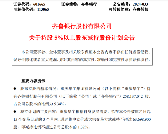 日前,A股上市城商行齐鲁银行发布了持股5%以上股东的减持公告。公告显示:重庆华宇集团有限公司持有齐鲁银行股份有限公司约2.58亿股,占公司总股本的比例为5.34%。重庆华宇根据自身发展需要,拟在本公告披露之日起15个交易日后的3个月内,通过集中竞价或大宗交易方式减持不超过约6370万股,即减持比例不超过公司总股本的1.32%。