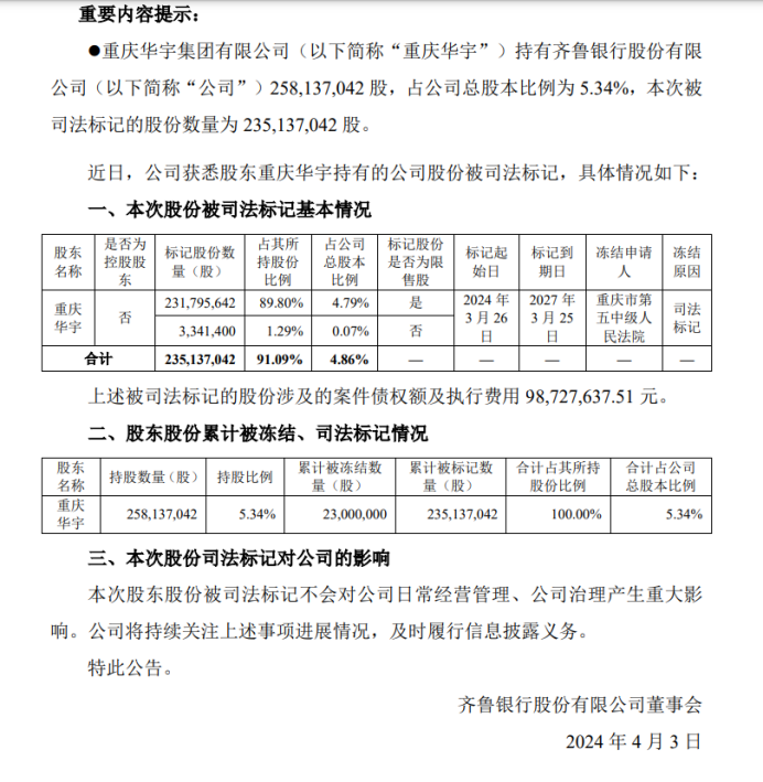 也就是说,后续华宇集团想要减持所持齐鲁银行的股份,还得先解押了再说。