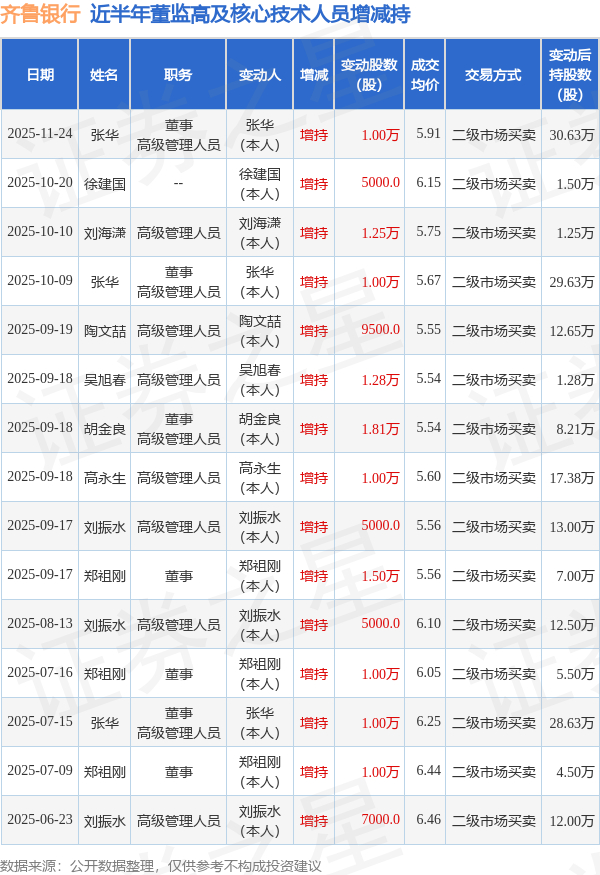 齐鲁银行近半年内的董监高及核心技术人员增减持详情如下: