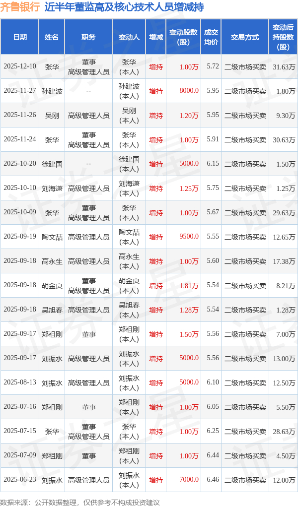 齐鲁银行近半年内的董监高及核心技术人员增减持详情如下: