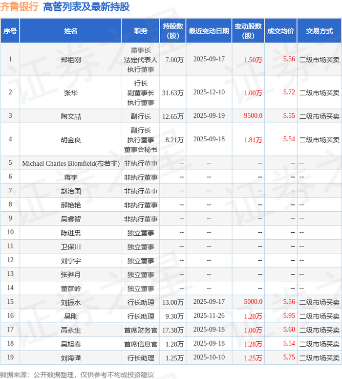 齐鲁银行的高管列表及最新持股情况如下:
