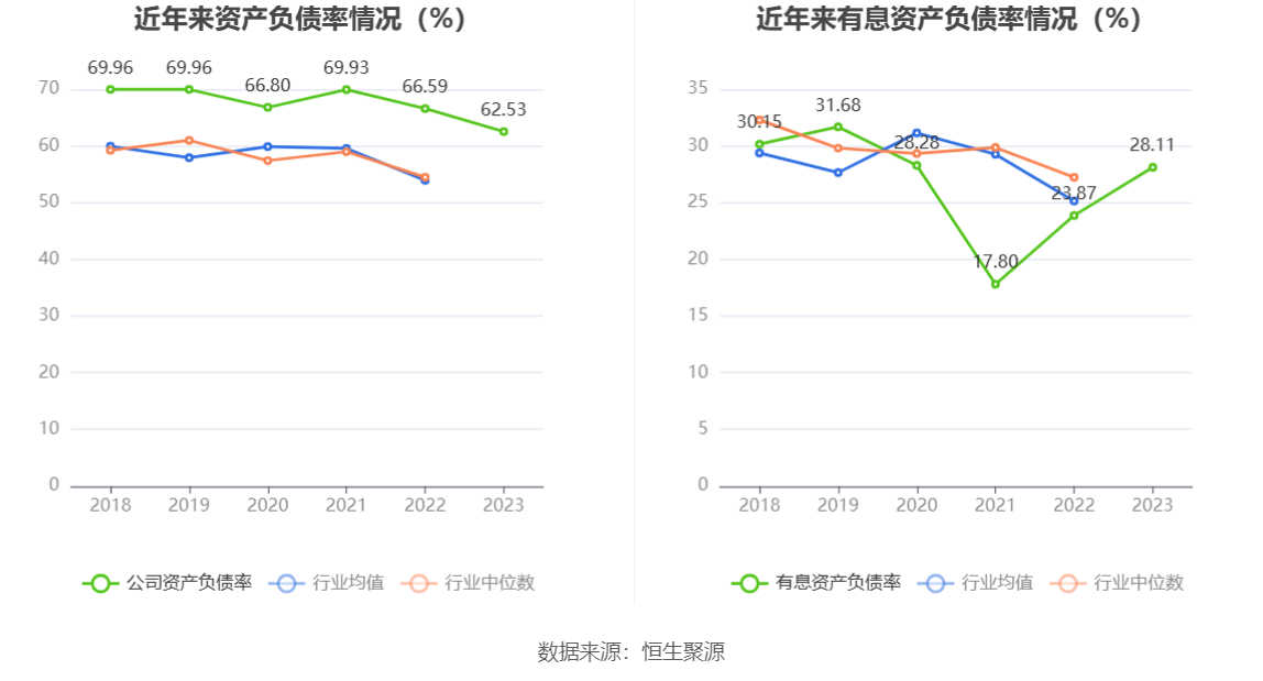 在偿债能力方面,公司2023年年末资产负债率为62.53%,相比上年末下降4.00个百分点;有息资产负债率为28.11%,相比上年末上升4.24个百分点。