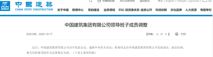 据中建集团官网10月17日消息,近日,中国建筑集团有限公司召开党组会议,通报中央有关决定:陈勇任中国建筑集团有限公司党组成员、副总经理。相关任职事项按有关法律规定办理。