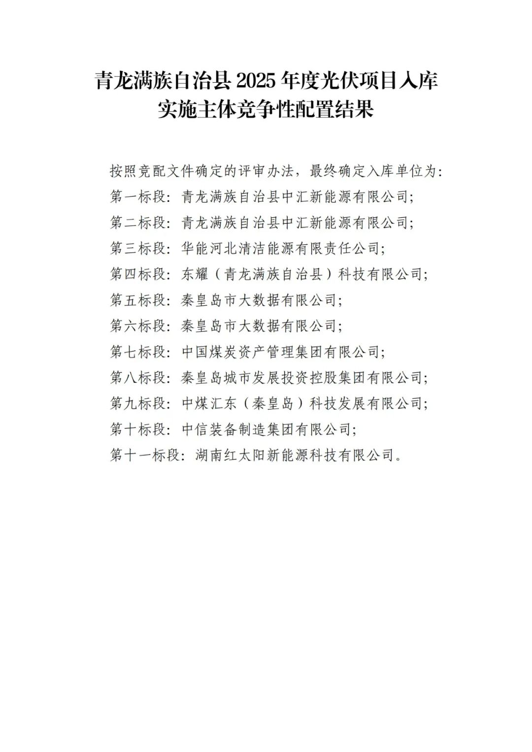 2.青龙满族自治县2025年度光伏项目入库实施主体竞争性配置结果