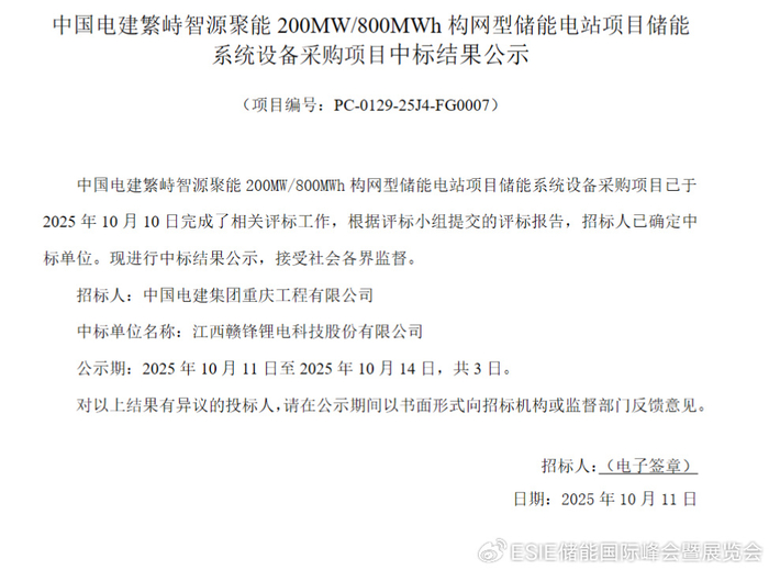中国电建200MW/800MWh构网型储能电站储能系统中标人公示