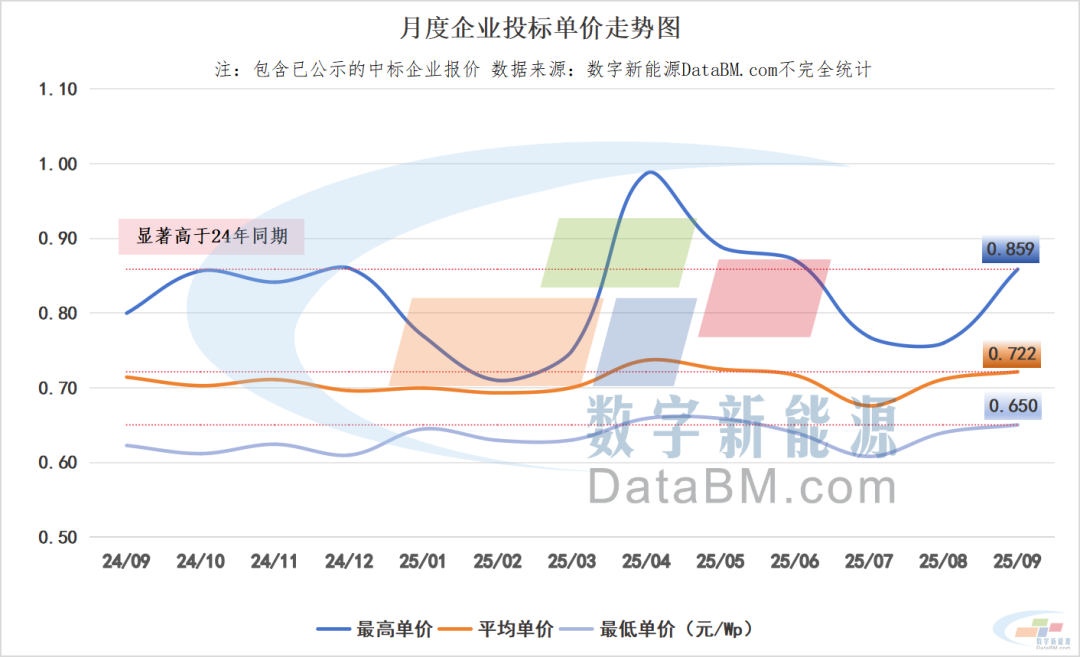 价格最高点出现中国铁塔股份有限公司吉林省分公司2025年基站光伏组件采购项目中,成都昊普环保技术有限公司报出0.859元/W的价格。