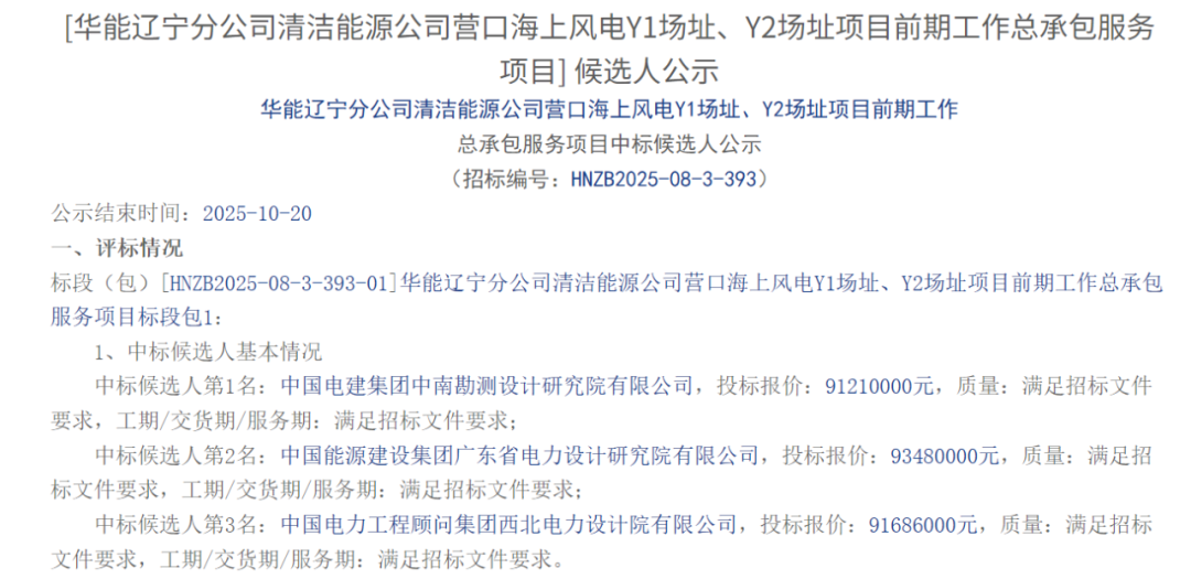 10月16日,中国华能电子商务平台发布《华能辽宁分公司清洁能源公司营口海上风电Y1场址、Y2场址项目前期工作总承包服务项目中标候选人公示》的公告。