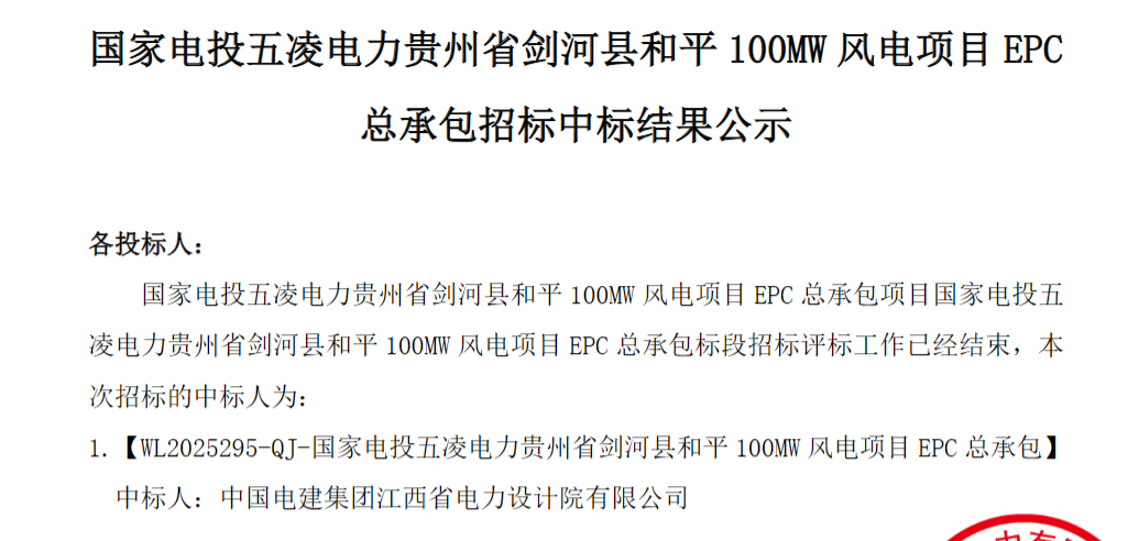 1月8日,国家电投电子商务平台发布国家电投五凌电力贵州省剑河县九龙基 100MW风电项目、国家电投五凌电力贵州省剑河县和平100MW风电项目EPC总承包项目招标中标结果公示。