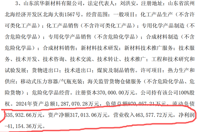 在股权融资不顺畅情况下,滨华新能源依靠负债推动项目建设,据滨化股份披露的2025年预计担保事项的公告,滨华新材料截至2024年底的资产负债率为75.38%。2024年,该公司营收为46.36亿元,净利润为-4.12亿元。截至2024年底,该公司总资产为128.71亿元,净资产为31.7亿元,其净资产已经低于37亿注册资本。
