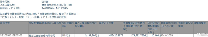 格隆汇10月17日丨根据联交所最新权益披露资料显示,2025年10月13日,华泰证券(06886.HK)获易方达基金管理有限公司在场内以每股均价20.2873港元增持313.72万股,涉资约6364.53万港元。