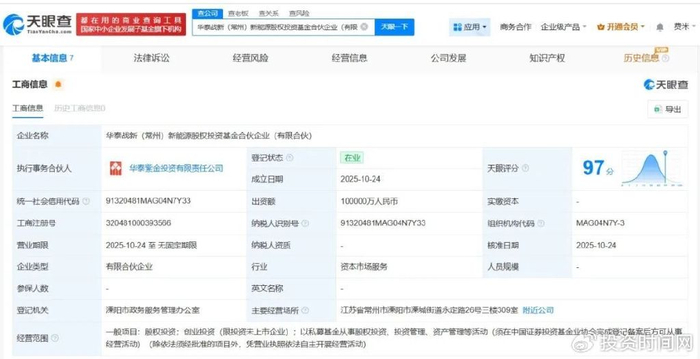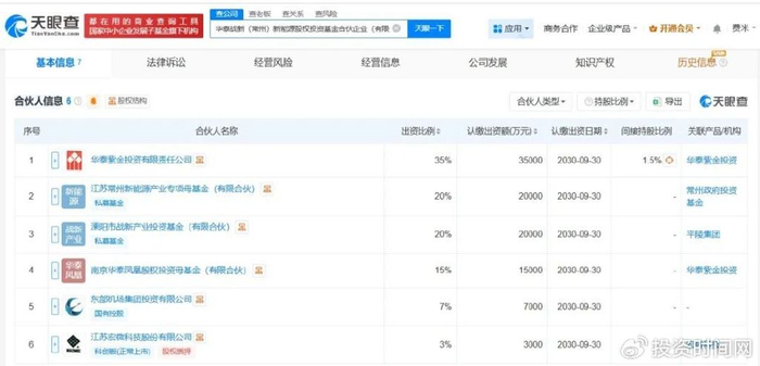 天眼查App显示,近日,华泰战新(常州)新能源股权投资基金合伙企业(有限合伙)成立,执行事务合伙人为华泰紫金投资有限责任公司,出资额10亿人民币,经营范围为股权投资,创业投资,以私募基金从事股权投资、投资管理、资产管理等活动,由华泰证券(601688)旗下华泰紫金投资有限责任公司、宏微科技(688711)、江苏常州新能源产业专项母基金(有限合伙)等共同出资。