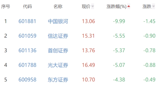 中国银河、信达证券、首创证券、光大证券、东方证券位列涨幅榜后五位,涨幅分别为-9.99%、-5.55%、-5.37%、-5.07%、-4.38%。