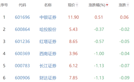 其中,中银证券、哈投股份、红塔证券、西南证券、长江证券、财达证券位列板块涨幅前五位,涨幅分别为0.51%、-0.37%、-0.57%、-1.00%、-1.13%、-1.13%。