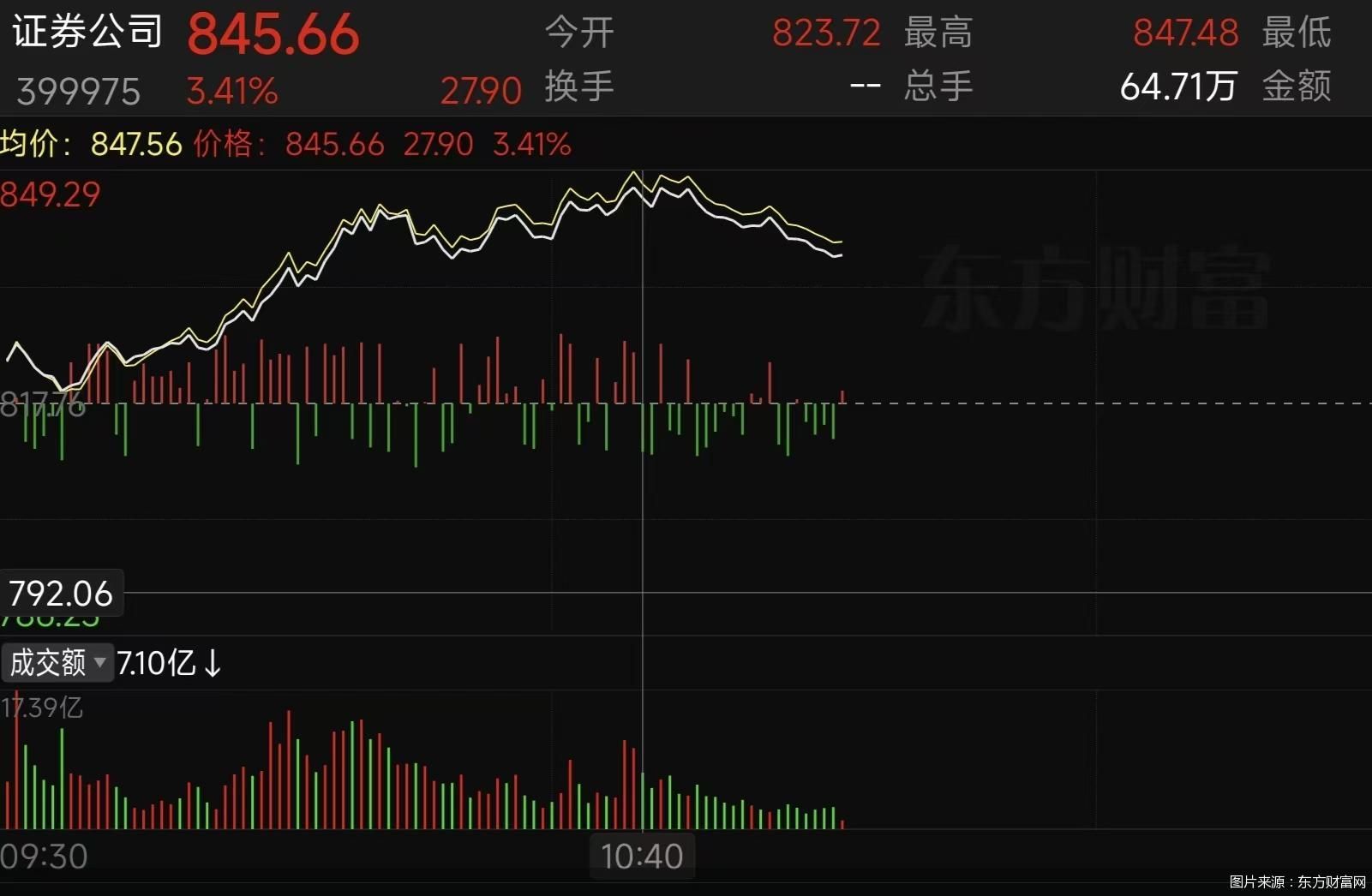 北京商报讯(记者 郝彦)7月11日早盘,证券公司板块开盘领涨,中证全指证券公司指数盘中更大幅走高。东方财富Choice数据显示,截至发稿,该指数报845.66点,已上涨3.41%。
