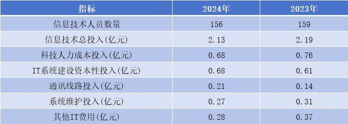 年报显示,2024年中银证券拥有信息技术人员156名。信息技术总投入2.13亿元,主要来自科技人力成本和IT系统资本性建设成本。