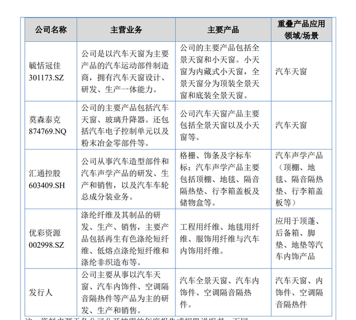天运股份主营业务为汽车天窗、废旧纺织品循环利用产品(汽车内饰件、空调件等)的研发、生产和销售。