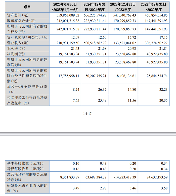 报告期内(2022年至2025年上半年),天运股份的营业收入分别为3.07亿元、3.34亿元、5.01亿元、2.11亿元;净利润分别为4092.24万元、2322.85万元、5193.04万元、1916.15万元。