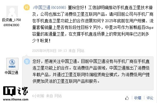 【中国卫通:目前没有与手机厂商在手机直连卫星功能上的合作】10 月 17 日消息,中国卫通今日在投资者互动平台透露,目前中国卫通没有与手机厂商在手机直连卫星功能上的合作。在消费级产品领域,中国卫通推出了消费级车载产品,并通过卫星互联网终端租赁商业模式,为消费级用户提供更加灵活的卫星互联网产品和服务。