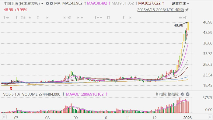 中国卫通9天5板续创历史新高,市值突破2000亿