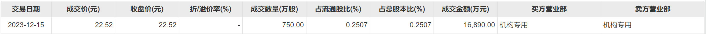 今日大宗交易成交750万股,成交额1.69亿元,占当日总成交额的38.65%,成交价22.52元,较市场收盘价持平。