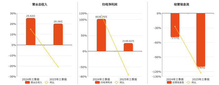 公司营业总收入为20.26亿元,在已披露的同业公司中排名第58,较去年同报告期营业总收入减少5.36亿元,同比较去年同期下降20.93%。归母净利润为2140.02万元,在已披露的同业公司中排名第105,较去年同报告期归母净利润减少6396.77万元,同比较去年同期下降74.93%。经营活动现金净流入为-2.61亿元,在已披露的同业公司中排名第124,较去年同报告期经营活动现金净流入减少1.44亿元。
