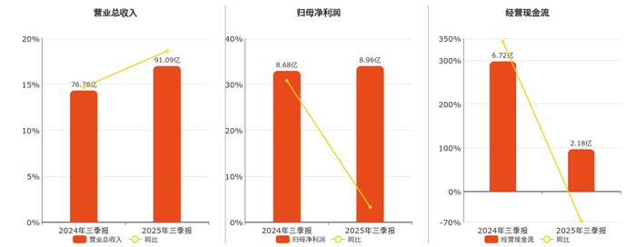 公司营业总收入为91.09亿元,在已披露的同业公司中排名第21。归母净利润为8.96亿元。经营活动现金净流入为2.18亿元,在已披露的同业公司中排名第19,较去年同报告期经营活动现金净流入减少4.54亿元,同比较去年同期下降67.52%。