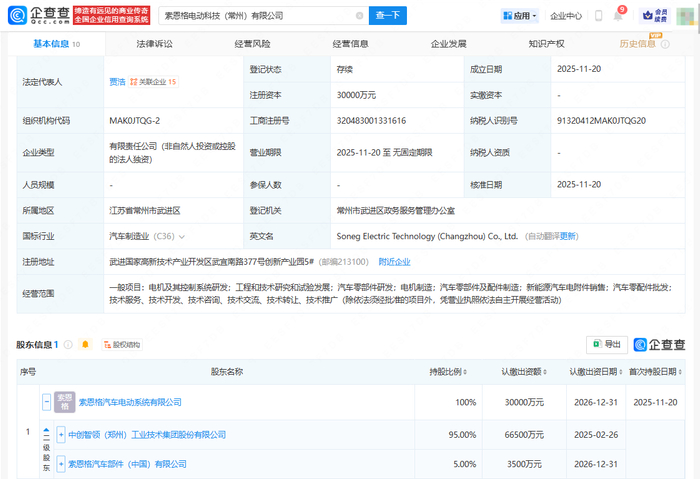 企查查APP显示,近日,索恩格电动科技(常州)有限公司成立,法定代表人为贾浩,注册资本3亿人民币,经营范围涉及电机及其控制系统研发、工程和技术研究和试验发展、汽车零部件研发、电机制造等。企查查股权穿透显示,该公司由中创智领(601717)、索恩格汽车部件(中国)有限公司间接共同持股。