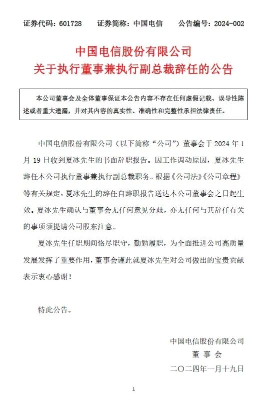 股份有限公司发布关于执行董事兼执行副总裁辞任的公告。公告称,中国电信股份有限公司董事会于2024年1月19日收到夏冰的书面辞职报告。