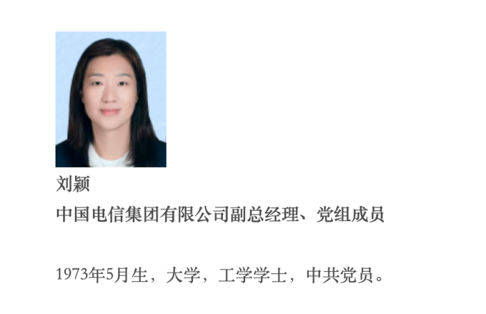 官网“集团领导”一栏显示,刘颖已任中国电信集团有限公司副总经理、党组成员。
