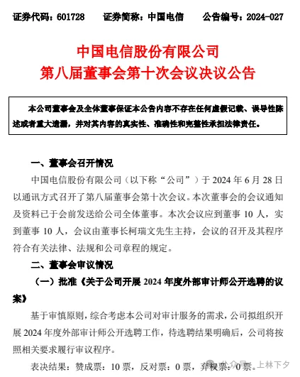 6月28日晚间,中国电信公告称,公司拟组织开展2024年度外部审计师公开选聘工作。5月27日,中国电信2023年年度股东大会通过议案,聘任普华永道为2024年度外部审计师,审计收费参考2023年度的5900万元。