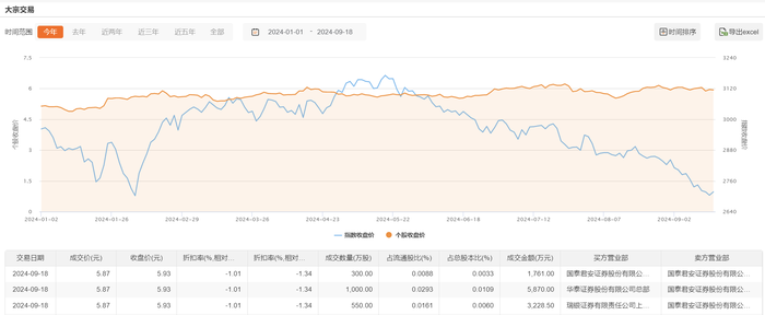 今日大宗交易成交1850万股,成交额1.09亿元,占当日总成交额的19.82%,成交价5.87元,较市场收盘价折价1.01%。