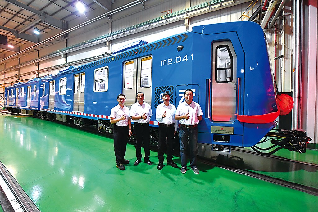 为墨西哥首都墨西哥城定制的铰接式轻轨列车首列车在中车株机公司下线。图为墨西哥来宾在列车旁合影。 陈泽国 摄