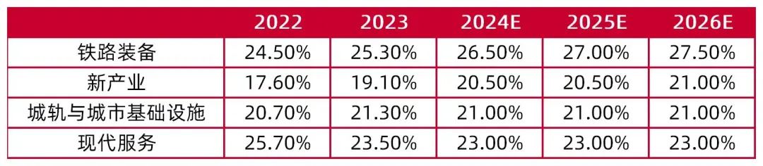 资料来源:wind,山西证券研究所从细分业务收入贡献来看,铁路装备、新产业、城轨业务占比较高。铁路装备的占比在2020年下降至39.7%,随后逐步恢复至2023年的41.9%。新产业的占比在2020年显著增加至31.5%(同比+8pct),2023年为34.4%。城轨业务的占比在2020年达到25.5%(同比+6pct),2023年下降至21.5%。现代服务的占比相对较小,在2-4%。