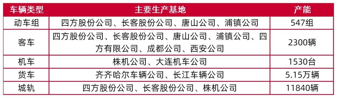 2015年,中国南车、中国北车重组设立中国中车,公司承继了南北车的全部业务和资产,是全球规模最大、品种最全、技术领先的轨道交通装备供应商。其中,轨交装备涵盖铁路装备(动车组、机车、客车、货车)和城市轨道装备(地铁、轻轨、磁浮等),核心产品均具有自主知识产权。截至2020年末,公司主要产品的产能为:动车组新造547组/年,机车新造1530台/年,客车新造2300辆/年,货车新造5.15万辆/年,城轨车辆总组装(含地铁、有轨电车、单轨、中低速磁浮)11840辆/年。