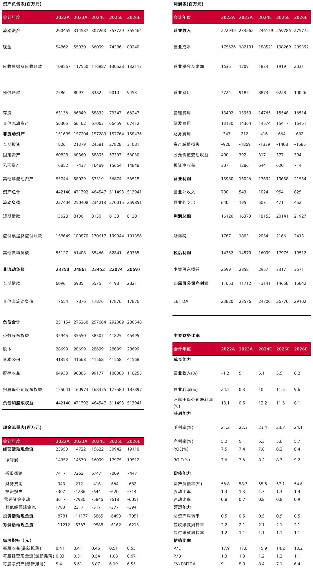 预计公司2024-2026年归母公司净利润131.4/146.6/158.4亿元,同比增长12.2%/11.5%/8.1%,对应8月29日股价PE为15.9/14.2/13.2倍,首次覆盖给予“买入-A”评级。