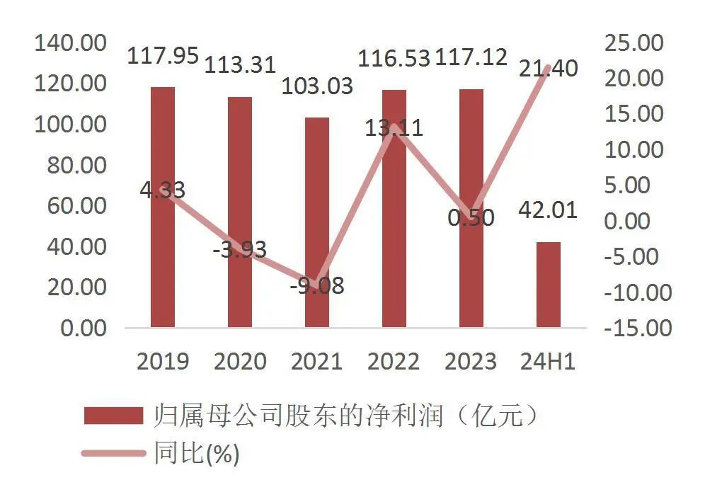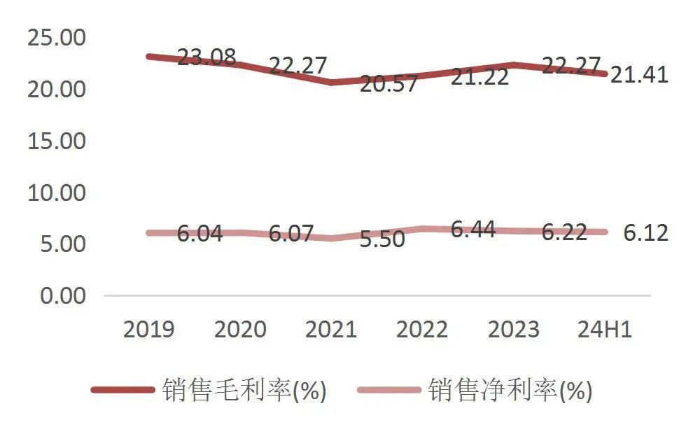 资料来源:wind,山西证券研究所盈利端,2023年归母净利润117.12亿元,基本恢复到疫情前(2019年)水平。毛利率端,受到细分产品毛利率水平和产品结构的影响,整体保持在20-23%之间,24H1下滑至21.41%。销售净利率在5.5%-6.5%之间,波动较小,24H1因为费用率的影响,下滑至6.12%。
