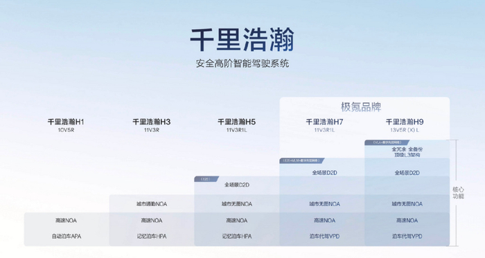 千里智驾推出的“千里浩瀚”智能辅助驾驶系统,提供了从H1到H9多个级别的解决方案,这些方案正快速覆盖吉利银河、领克、极氪等多个品牌车型。
