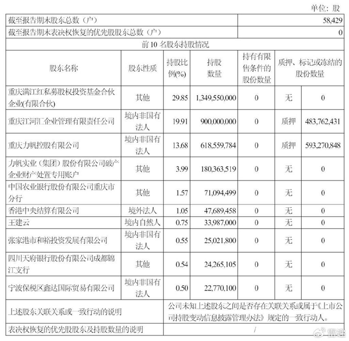 截至2025年6月30日,重庆满江红私募股权投资基金合伙企业(有限合伙)持股为29.85%,重庆江河汇企业管理有限责任公司持股为19.91%,重庆力帆控股有限公司持股为13.68%,力帆实业(集团)股份有限公司破产企业财产处置专用账户持股为3.99%;