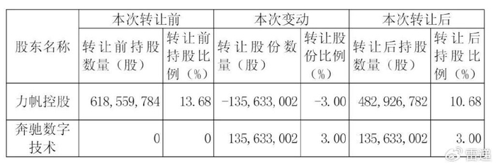 此次交易后,力帆控股持股从13.68%降至10.68%,奔驰数字技术持股比例提升至3%。