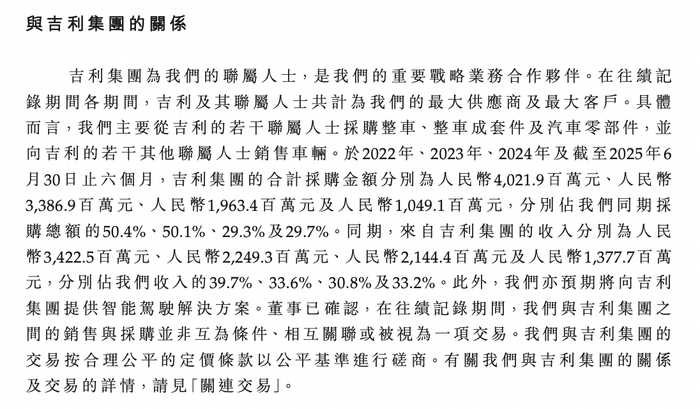 于2022年、2023年、2024年及截至2025年6月30日止六个月,吉利集团的合计采购金额分别为40.22亿元、33.87亿元、19.63亿元及10.49亿元,分别占同期采购总额的50.4%、50.1%、29.3%及29.7%。
