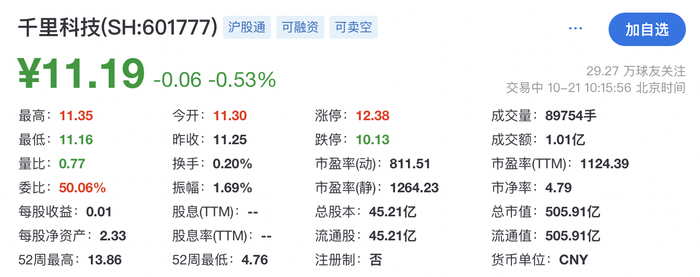 据了解,于2010年11月,千里科技完成A股在上海证券交易所上市(股票代码:601777)。截至发稿时,其A股报11.19元,总市值约505.91亿元。