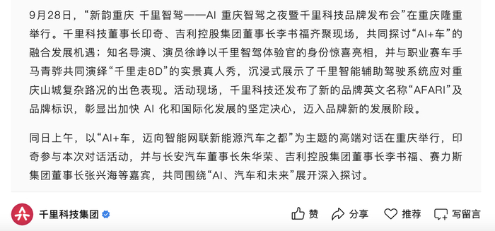 今年9月28日,千里科技召开了更名之后的首次发布会。吉利控股集团董事长李书福出现在发布会现场,用一句“相见恨晚”道出了他对千里科技及其董事长印奇的期许。