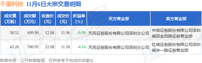 证券之星消息,11月6日千里科技发生大宗交易,交易数据如下: