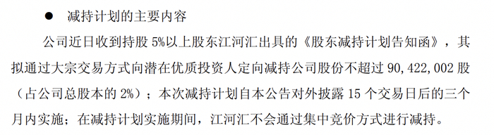 江河汇拟通过大宗交易方式向潜在优质投资人定向减持千里科技股份不超过9042.2万股(占公司总股本的2%);本次减持计划自本公告对外披露15个交易日后的三个月内实施;在减持计划实施期间,江河汇不会通过集中竞价方式进行减持。