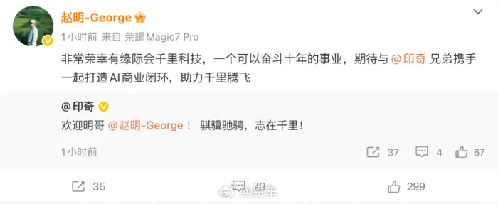 #汽车情报局#【荣耀前CEO赵明加入千里科技 负责推进商业化】2月12日,荣耀前CEO赵明宣布加入千里科技,任联席董事长,同时被推选为公司第六届董事会非独立董事候选人。赵明表示,非常荣幸有缘际会千里科技,一个可以奋斗十年的事业,期待与印奇兄弟携手一起打造AI商业闭环,助力千里腾飞。