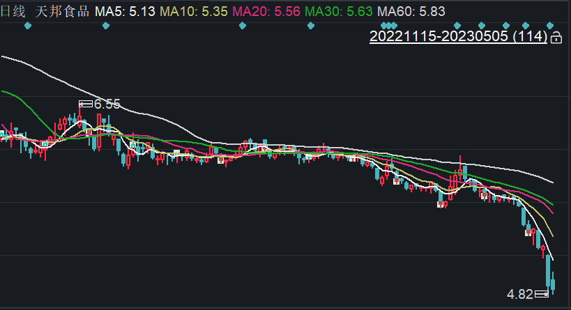 值得注意的是,5月4日节后首个交易日始,天邦食品股价波动剧烈,连续下跌。其中,5月4日当天,公司股价一度下跌8%,终收于4.89元/股,跌幅收于6.86%;5月5日,公司股价再度震荡下跌收于4.86元/股,跌幅为0.61%。部分投资者或因此受损。