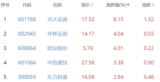 其中,光大证券、华林证券、哈投股份、中信建投、东方财富位列板块涨幅前五位,涨幅分别为8.15%、4.04%、4.01%、3.38%、2.94%。